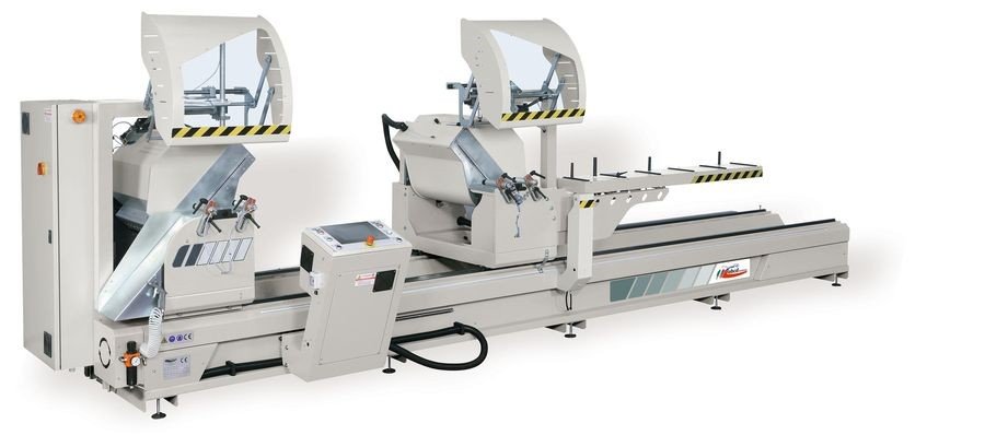Piła CNC model MASTER A. Wysokiej jakości piła dwugłowicowa ze stałą głowicą tnącą po lewej stronie i jedną ruchomą po prawej stronie. Automatyczne pozycjonowanie ruchomej głowicy i automatyczne / elektroniczne przechylanie zespołów tnących. Maksymalna dokładność cięcie oraz pozycjonowania poprzez ustawienie prawej głowicy dzięki prowadnicom LM umieszczonym na ramie. Automatyczne przechylanie głowic tnących 20 ° / 45 ° / 90 ° / -45 ° oraz kątów pośrednich. Wysoka wydajność cięcia. Przy ruchomej głowicy znajduje się stół podporowego 2,30 m. Smarowanie mikroproplami z czystym olejem. Strefa cięcia chroniona przez pełne osłony. Odczyt pomiaru na sterowniku dzięki enkoderowi zamontowanemu na silniku bezszczotkowym. Możliwość pomocy zdalnej za pośrednictwem Internetu.