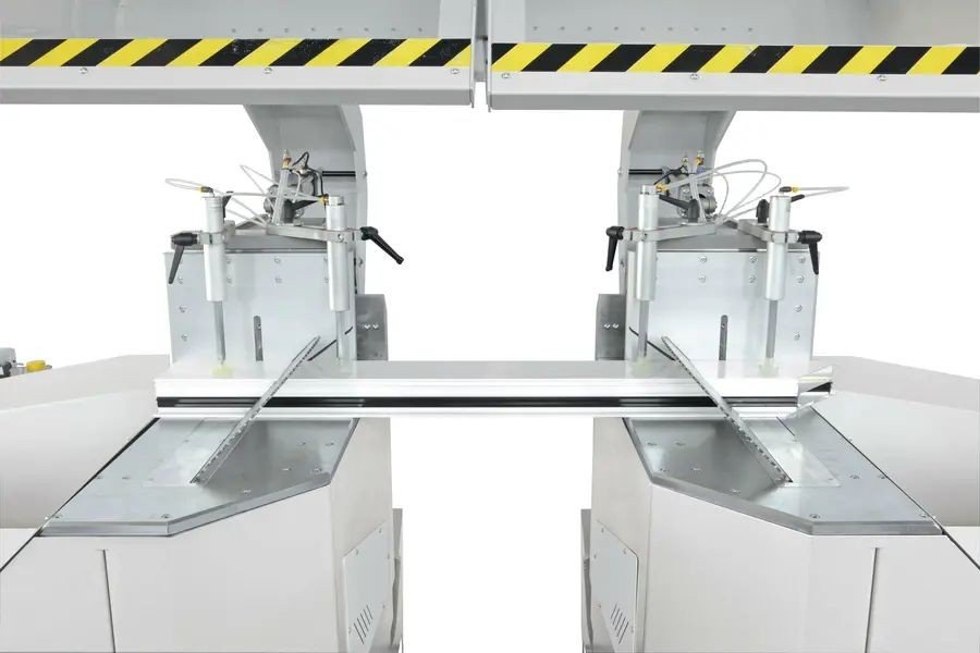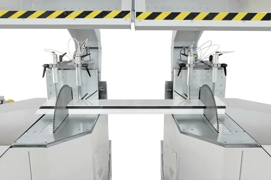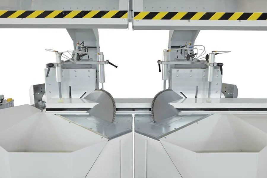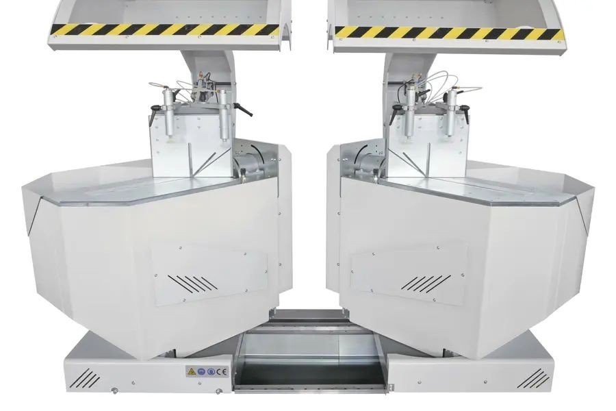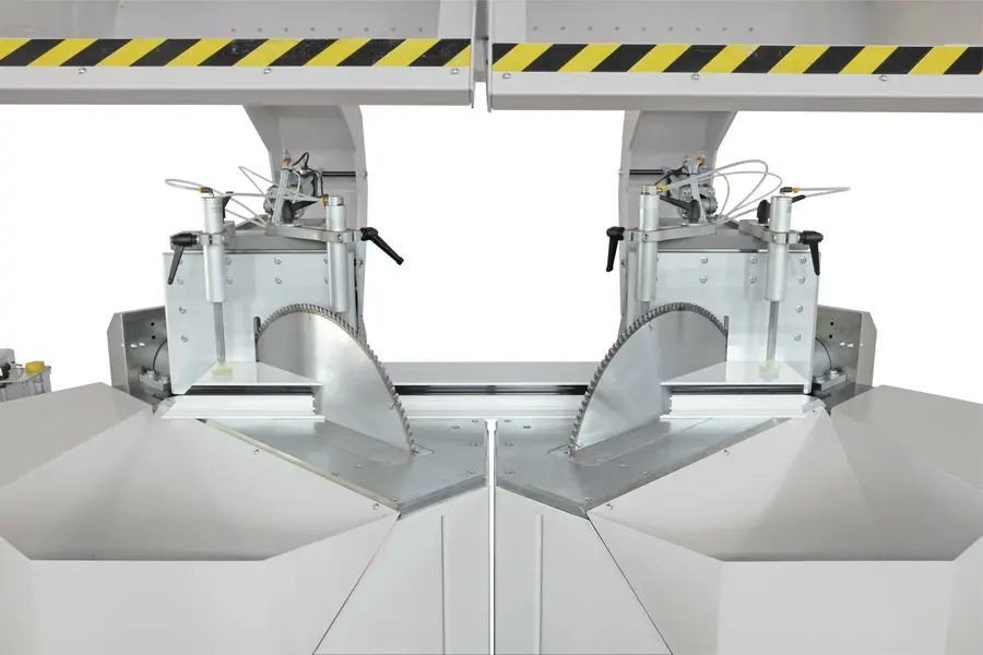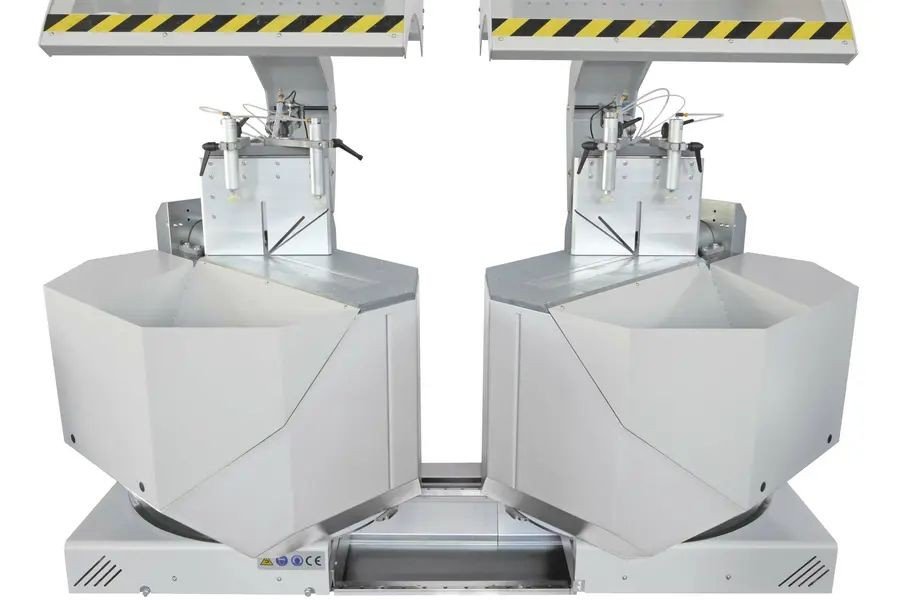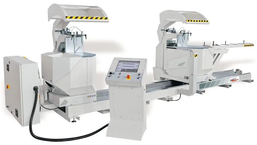 Wysokiej jakości piła przystosowana do cięcia profili aluminiowych. Lewa i prawa głowica sterowane numerycznie CNC. Automatycznie obracana głowice do środa i na zewnątrz za pomocą silnika bezszczotkowego w zakresie 22,5 ° 90 ° -140. Automatycznie pochylane tarcze do środka w zakresie 90 ° -45 °. Tarcze o średnicy 600 mm. Dwa silniki o mocy 3 kW każdy. Smarowanie za pomocą mikro kropli. Piła wyposażona w pełne osłony strefy cięcia z automatycznym podnoszenie oraz zamykanie strefy cięcia. Zestaw pionowych docisków pneumatycznych. Piła wyposażona w kolorowy wyświetlacz z ekranem dotykowym 17”. Złącza RJ45 – USB umożliwiają podłączenie maszyny online lub połącznie z innymi maszynami.